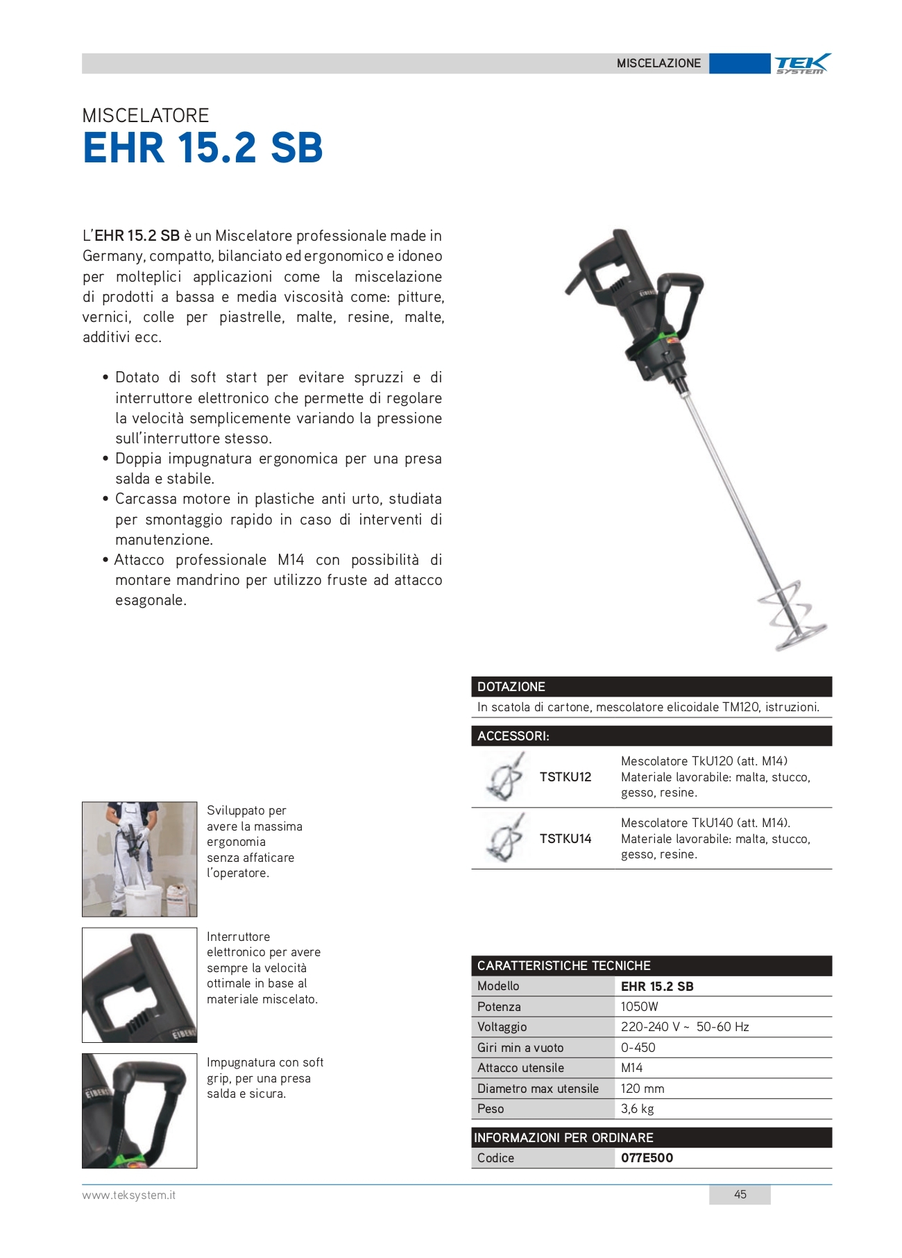 - Dotato di soft start per evitare spruzzi e di interruttore elettronico che permette di regolare la velocità semplicemente variando la pressione sull’interruttore stesso.
