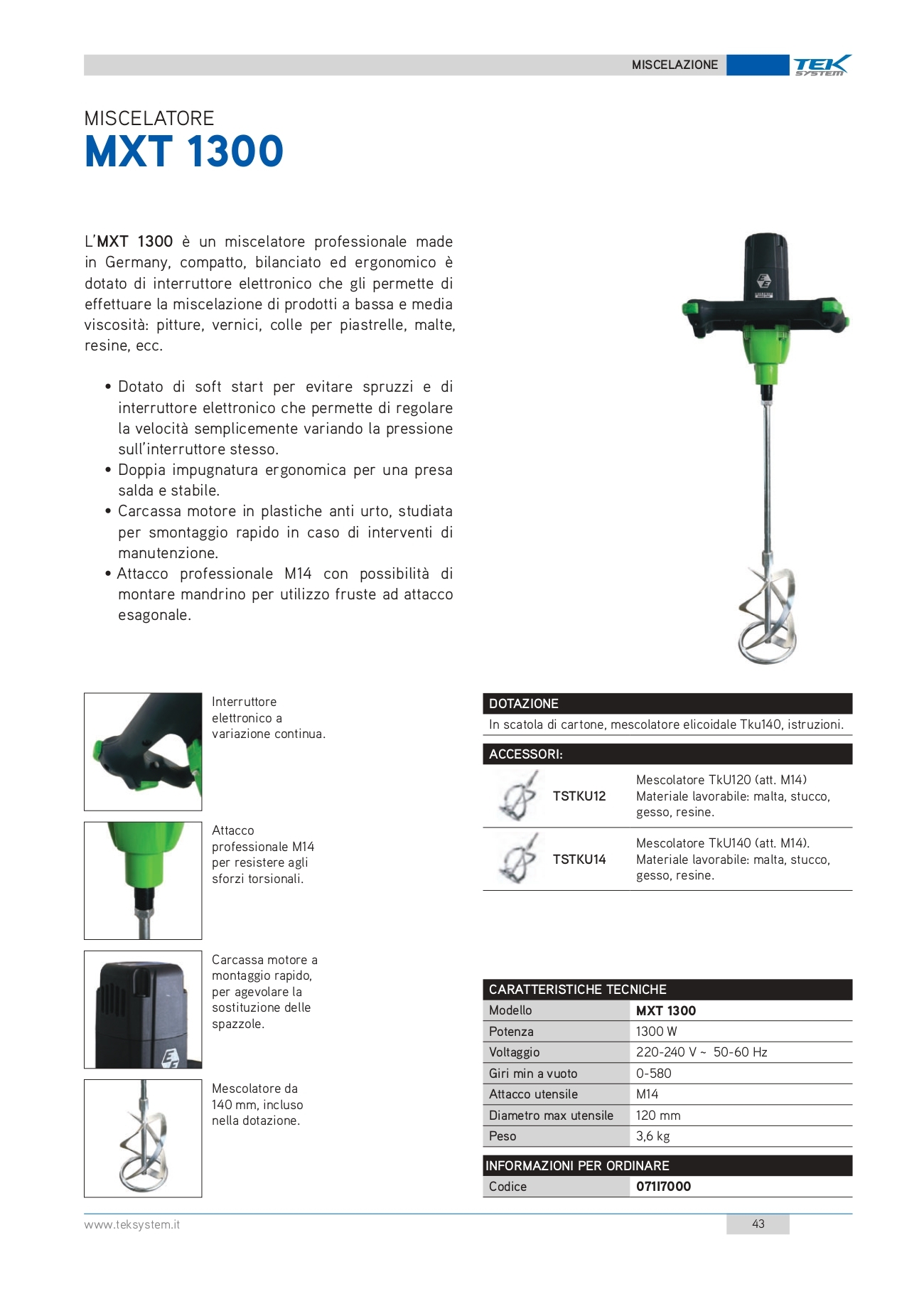 L’MXT 1300 è un Miscelatore professionale made in Germany, compatto, bilanciato ed ergonomico è dotato di interruttore elettronico che gli permette di effettuare la miscelazione di prodotti a bassa e media viscosità: pitture, vernici, colle per piastrelle, malte, resine, ecc.