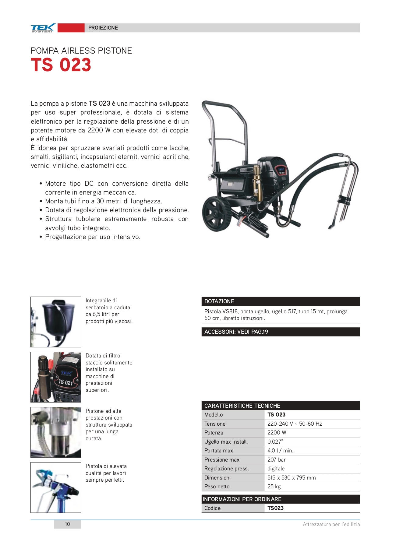 La pompa a pistone TS 023 è una macchina sviluppata per uso super professionale, è dotata di sistema elettronico per la regolazione della pressione e di un potente motore da 1000W con elevate doti di coppia e affidabilità.