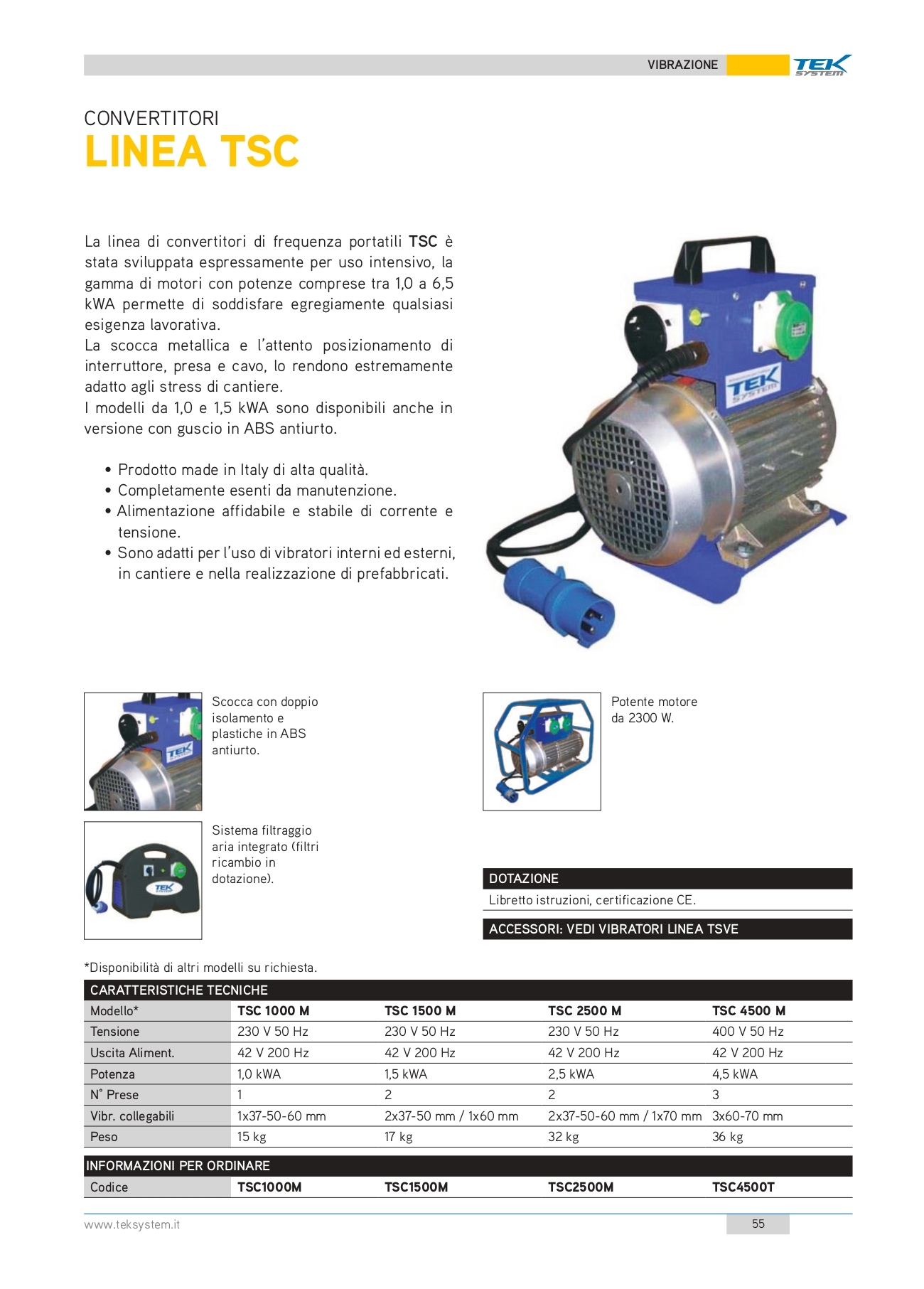 La linea di convertitori di frequenza portatili TSC è stata sviluppata espressamente per uso intensivo, la gamma di motori con potenze comprese tra 1,0 a 6,5 kWA permette di soddisfare egregiamente qualsiasi esigenza lavorativa. La scocca metallica e l’attento posizionamento di interruttore, presa e cavo, lo rendono estremamente adatto agli stress di cantiere. I modelli da 1,o e 1,5kWA sono disponibili anche in versione con guscio in ABS anti urto.