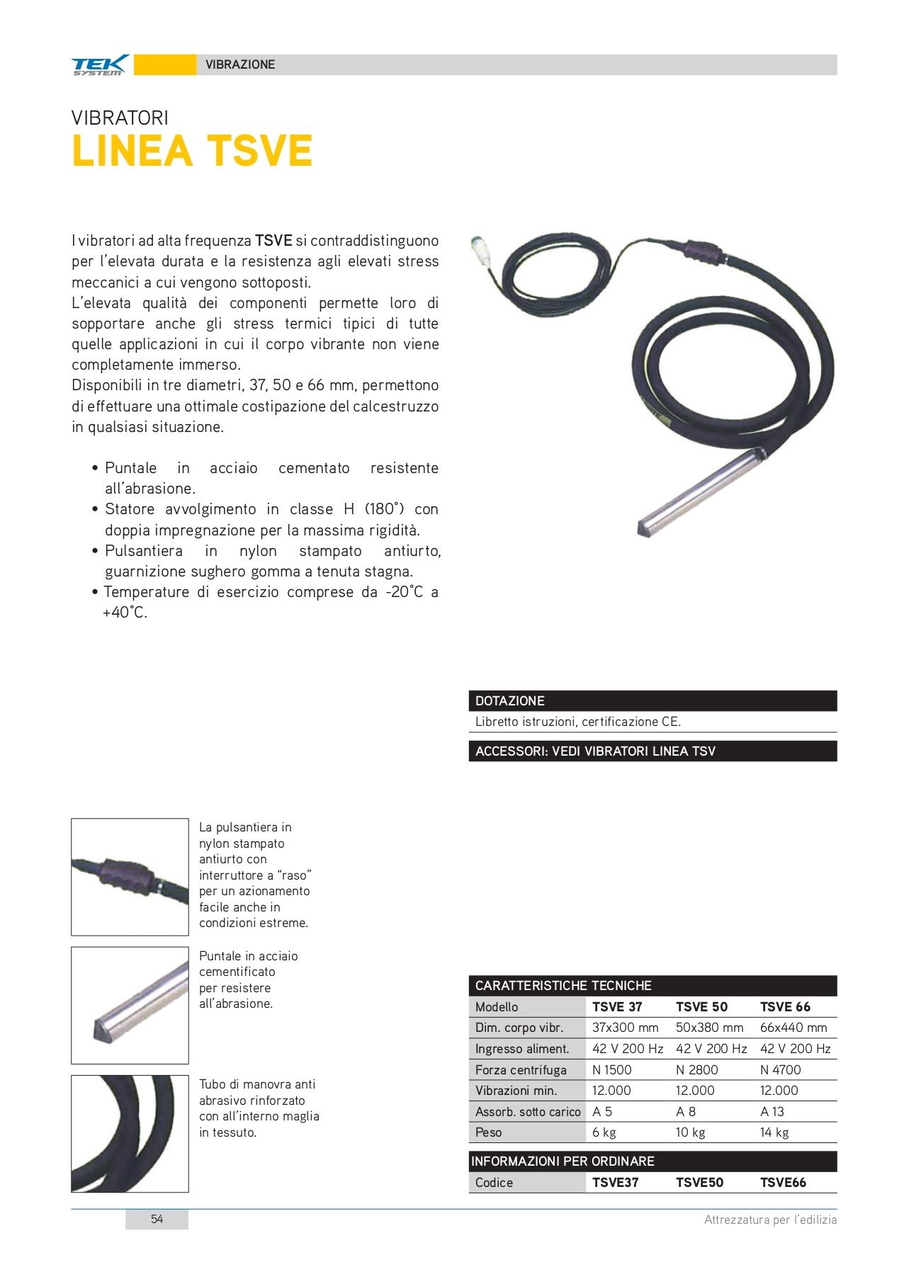 I vibratori ad alta frequenza TSVE si contraddistinguono per l’elevata durata e la resistenza agli elevati stress meccanici a cui vengono sottoposti. L’elevata qualità dei componenti permette loro di sopportare anche gli stress termici tipici di tutte quelle applicazioni in cui il corpo vibrante non viene completamente immerso. Disponibili in tre diametri, 37, 50 e 66mm, permettono di effettuare una ottimale costipazione del calcestruzzo in qualsiasi situazione.